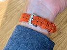 The battery has been replaced and it is working perfectly, paired with a leather brown strap. There's a small discolouration spot between 3 and 4 on the dial, fortunately not very visible on the wrist!