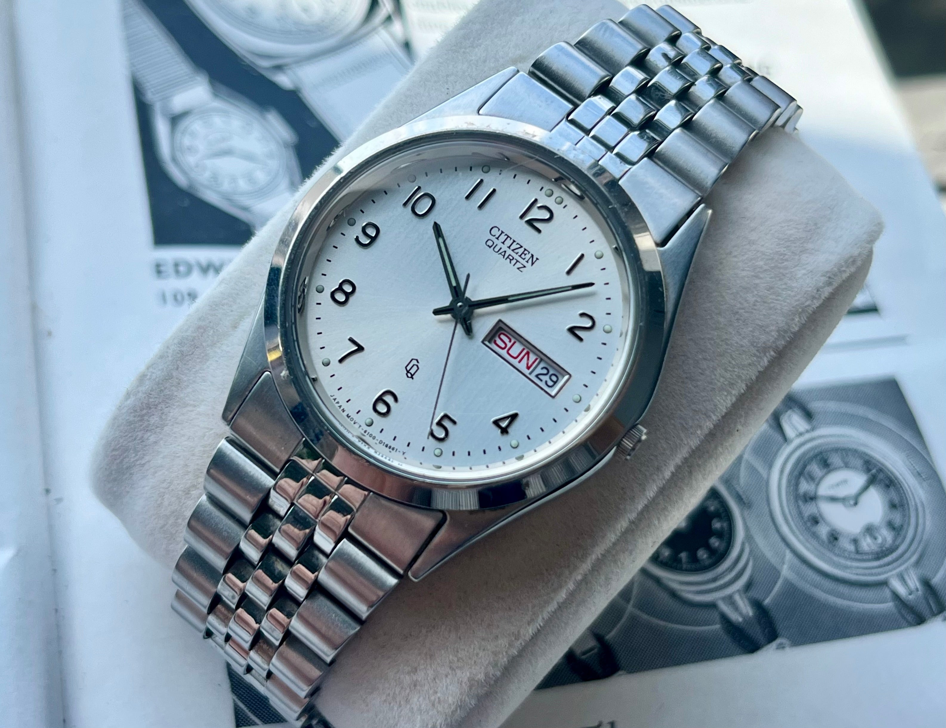 The watch, case and strap have been ultrasonically cleaned and are therefore completely neat again. Watch was fitted with a new battery on 29/6. Comes on the original Citizen Jubilee watch strap.