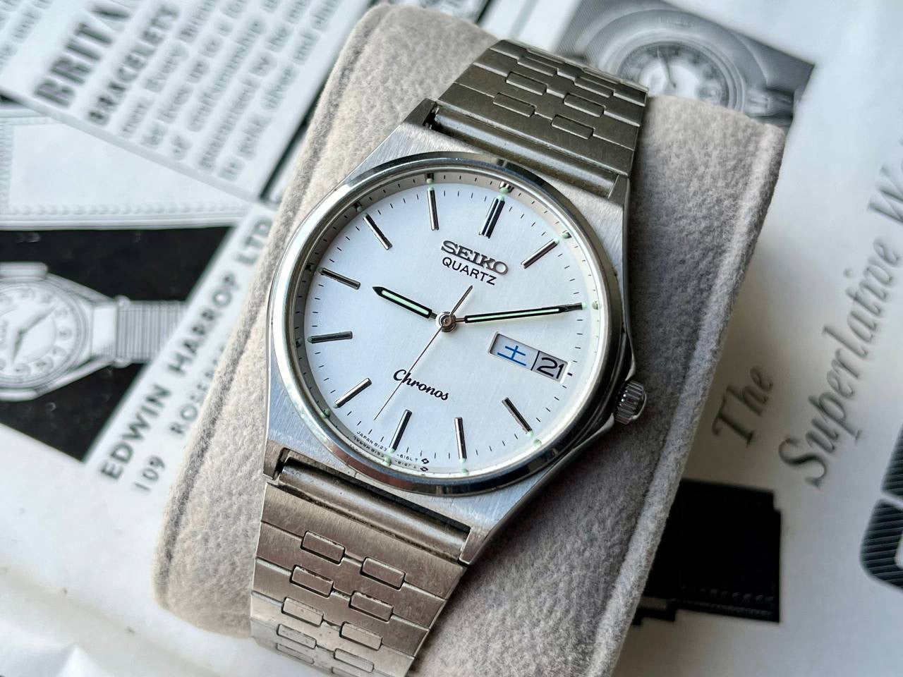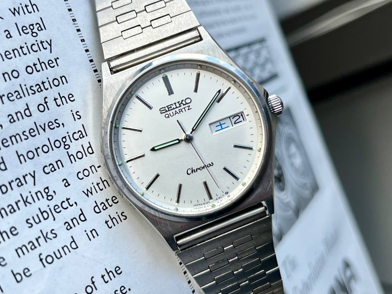 Top Seiko from the Chronos series with reference 8123-6130 from 1983. Watch is equipped with Seiko Quartz Caliber Ref. 8123 and measures 32 mm without crown, 10 mm thick with mineral glass and screw crown. This is a JDM (Japan Domestic Market Model) made for the Japanese market, so it has Kanji/English day indication. Watch comes with original box. This is model WJL040 from the 1983 catalog and cost 20,000 yen back then.