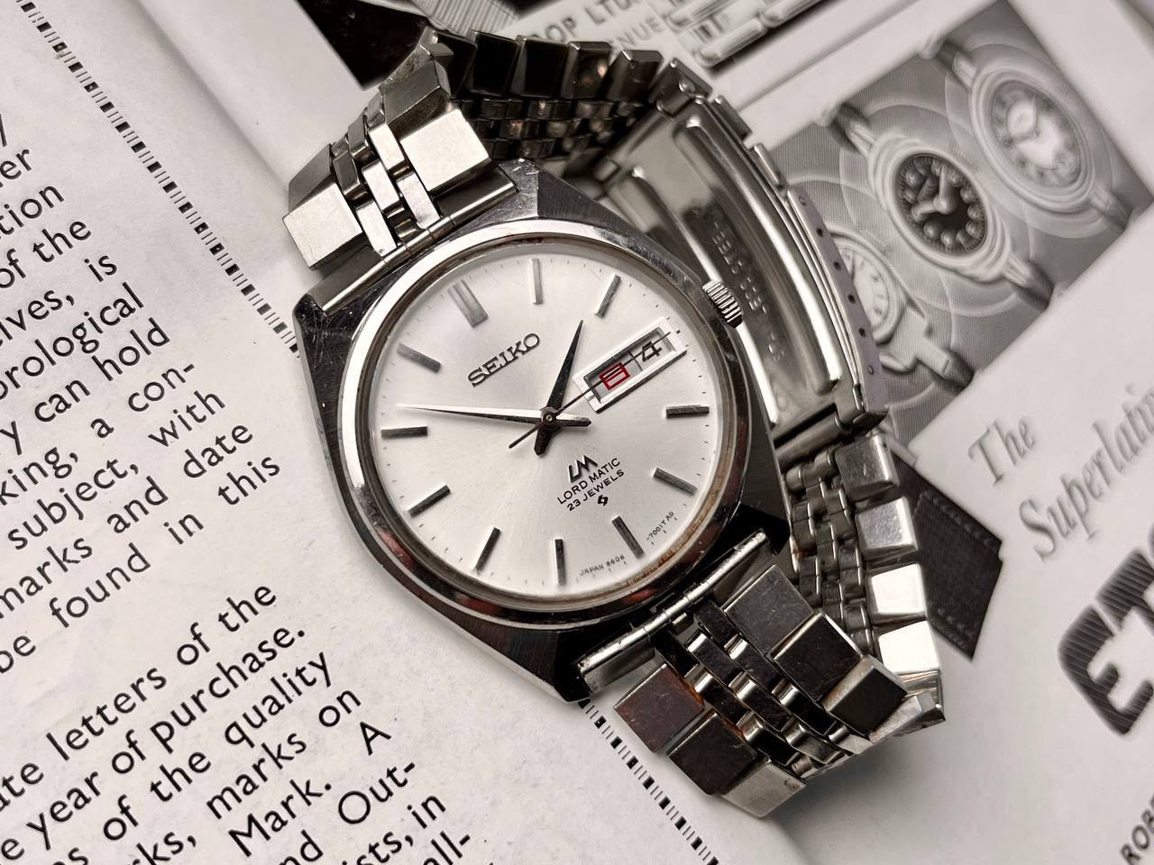 Vintage Seiko Lord Matic LM Automatic 5606-7000 from the late '70s, an embodiment of Seiko's 'grammar of design' at an exceptional value. Featuring a brushed front, polished sides, and distinctive indices on the dial, this Kanji/English day-date watch comes the original 5606-7000 rivet bracelet and clasp. Despite wear on the case and very minor scratches on the acrylic crystal, the watch operates well, displaying a minor deviation of about 10/s per day, while the quickset day- and date still work (something that often breaks on the 5606 caliber)