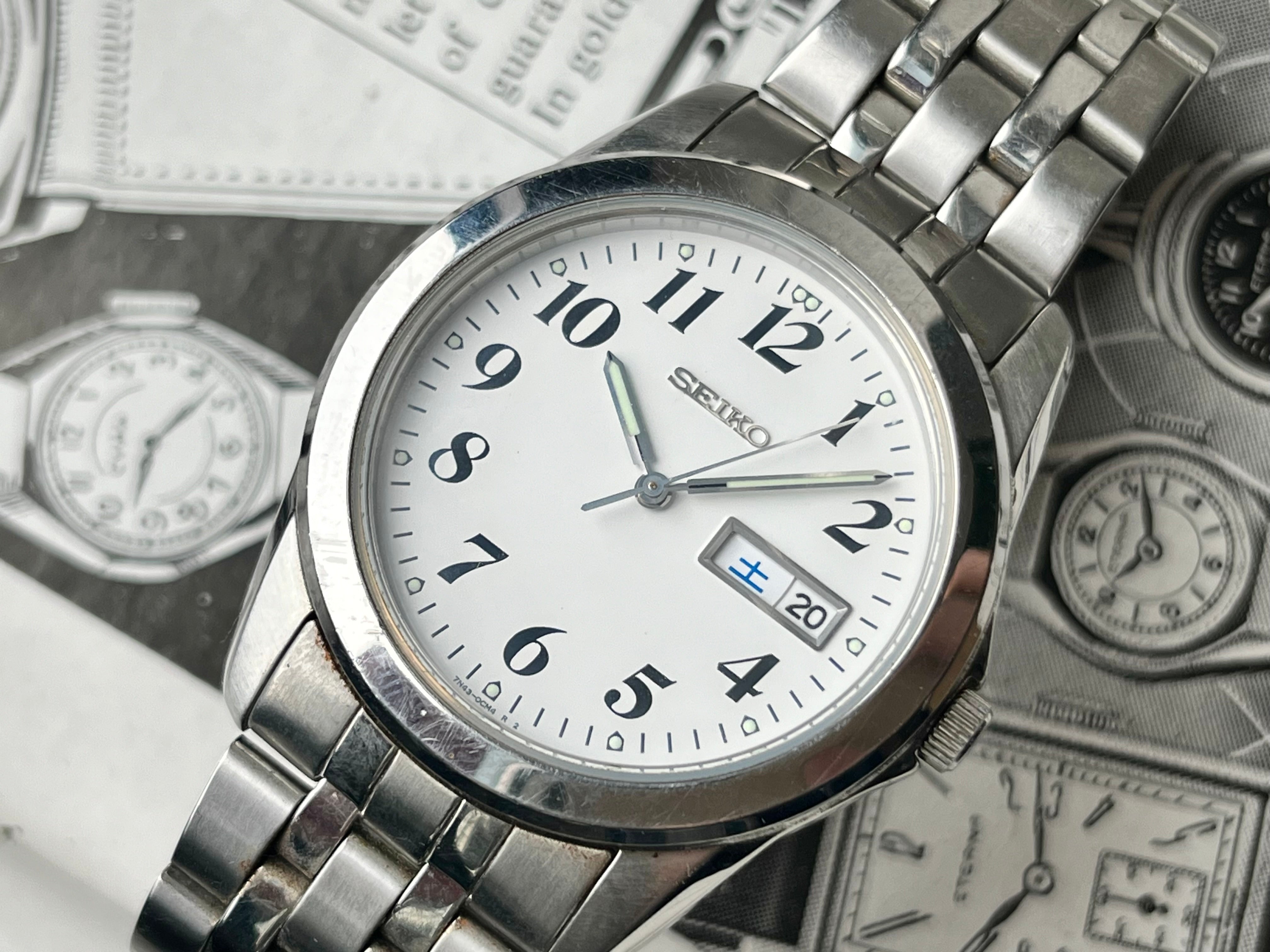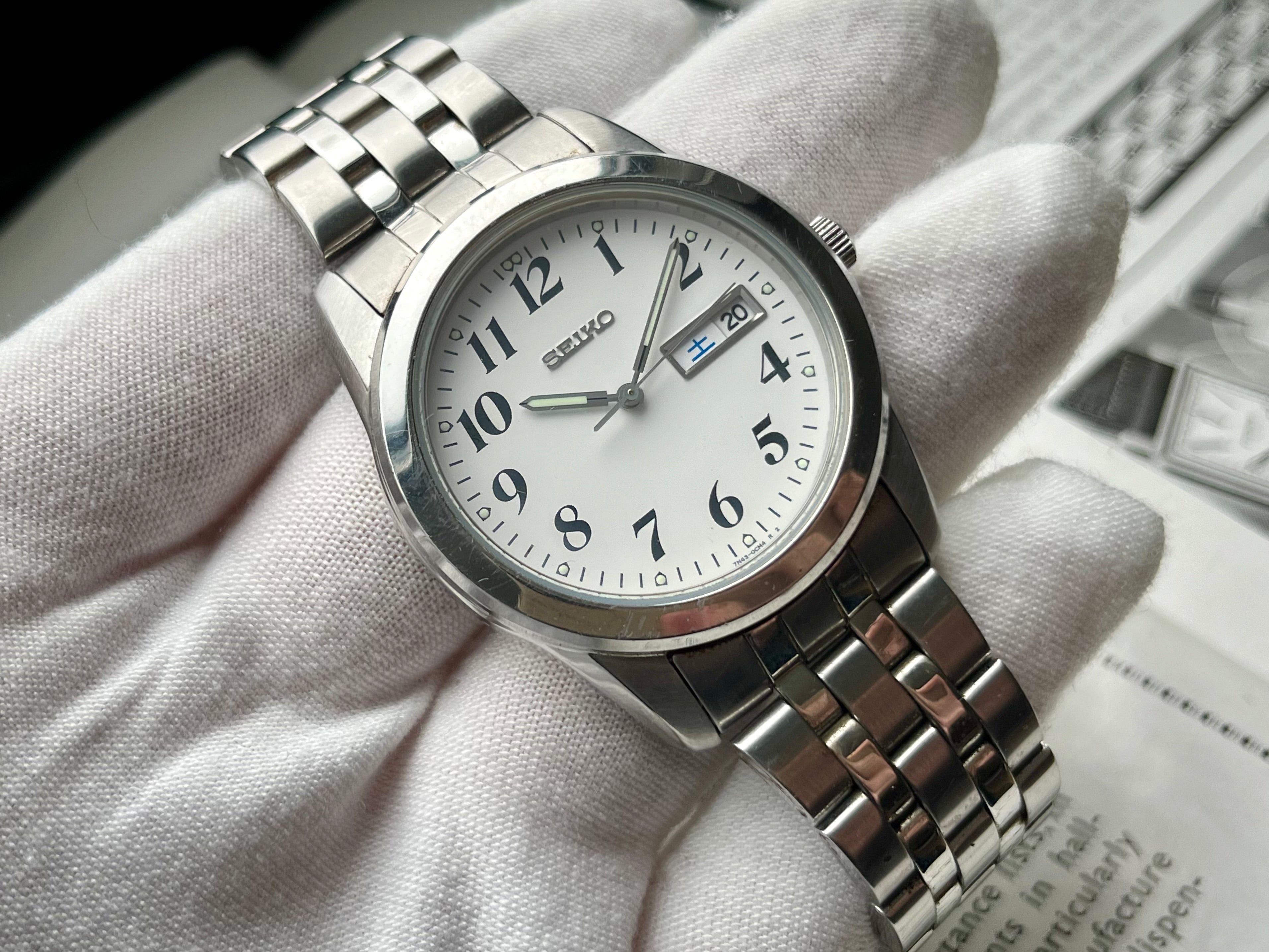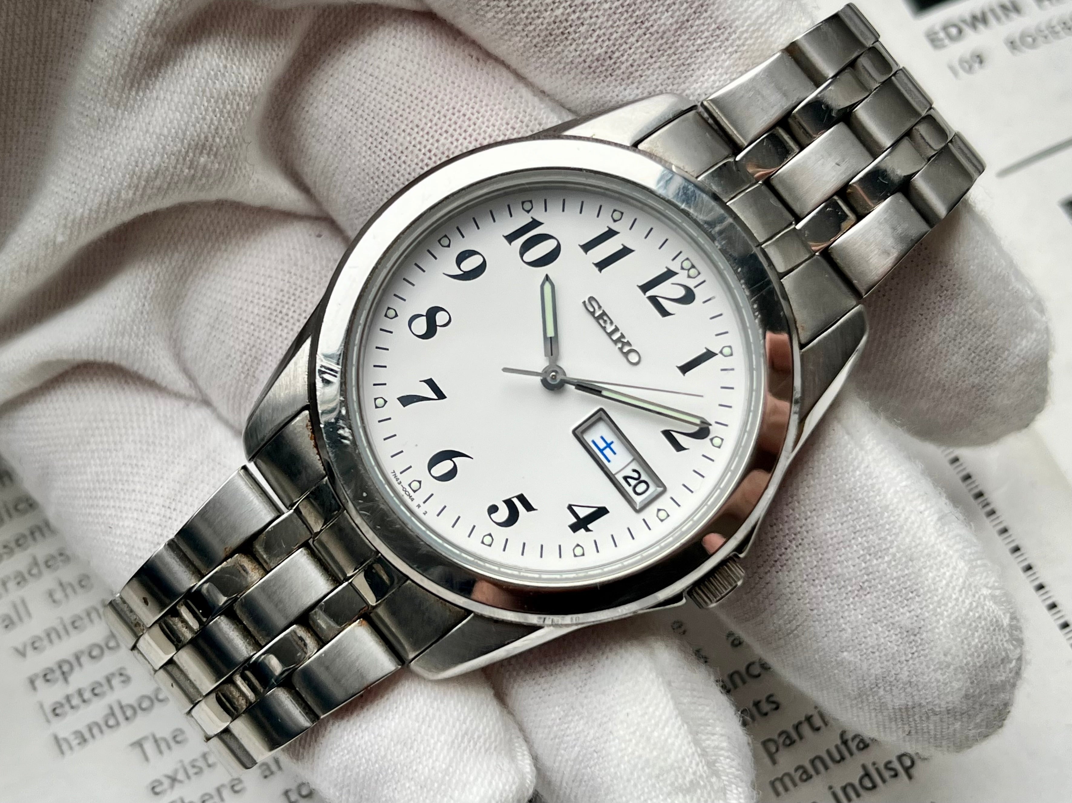 Nice big size Vintage Seiko Watch from the Spirit lineup reference 7N43-0AM0 with a white dial and fat black numerals produced in 2008. It's definetly an eye-catcher with 38mm stainless steel case with a big 45mm lug-to-lug!