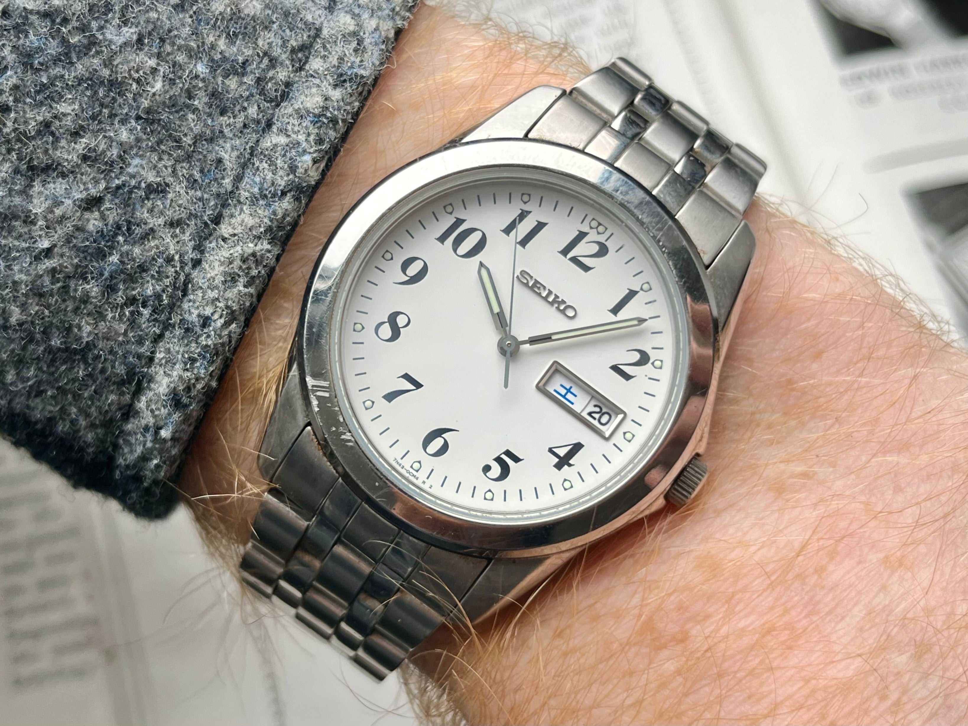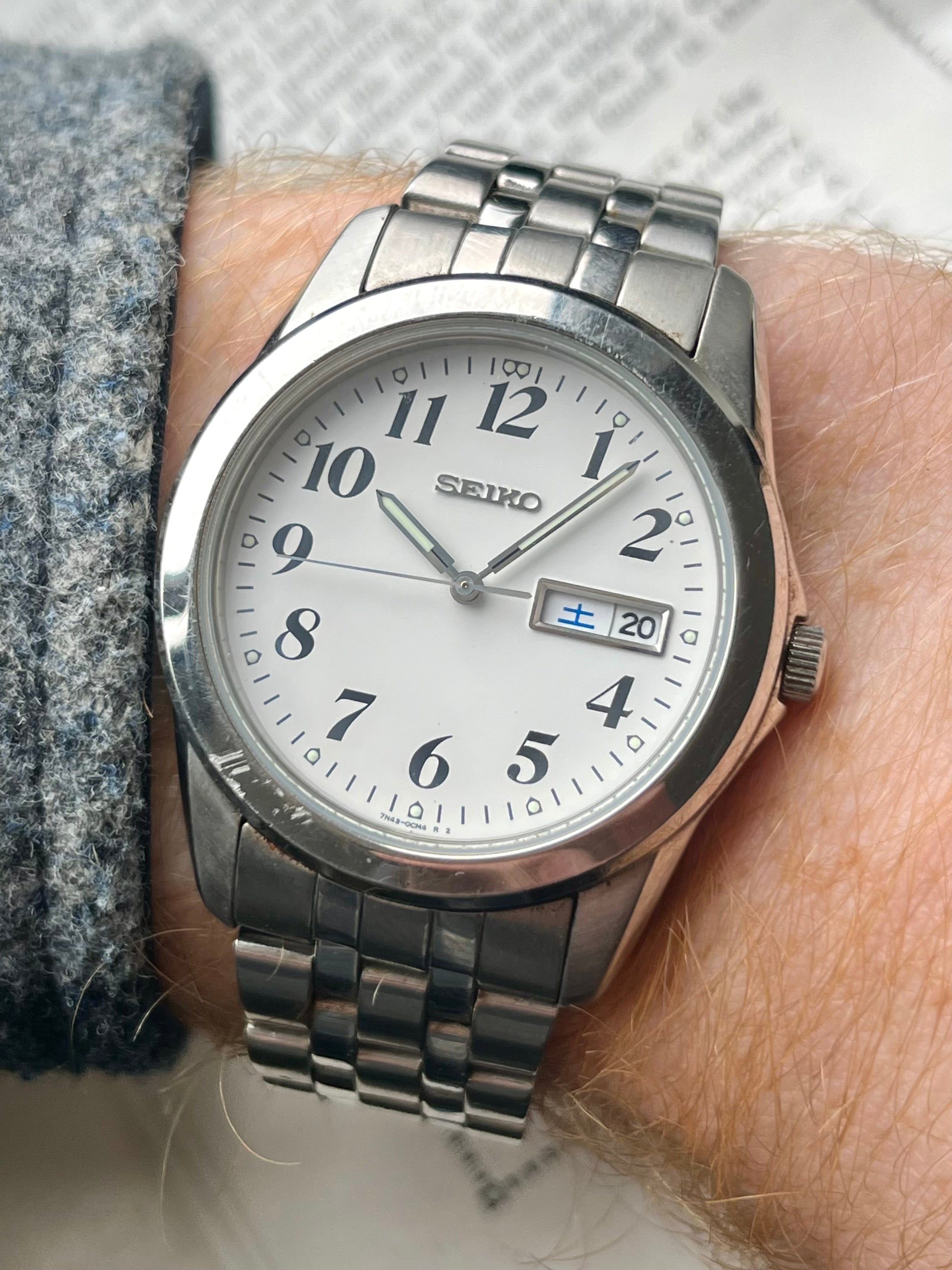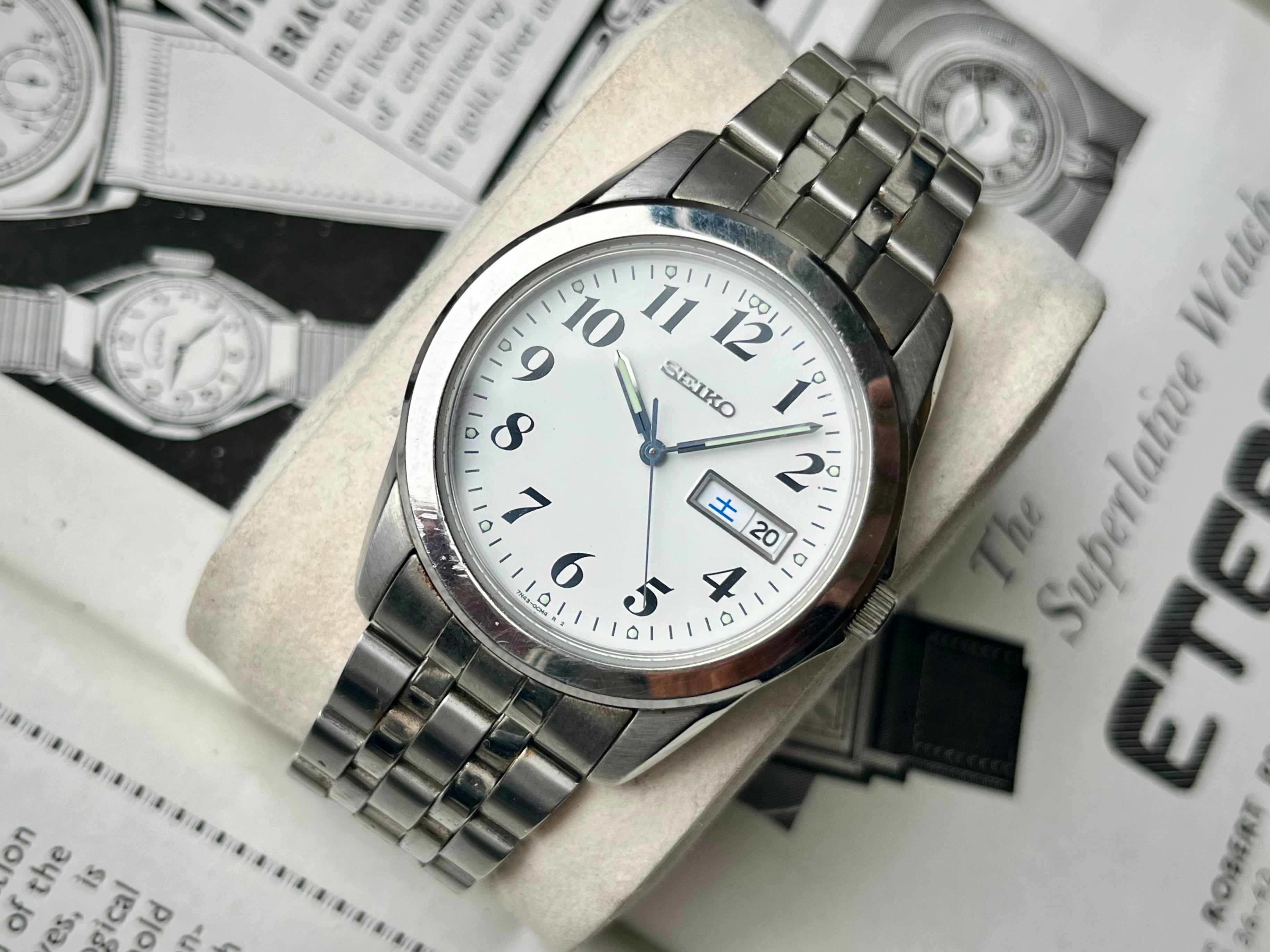 Nice big size Vintage Seiko Watch from the Spirit lineup reference 7N43-0AM0 with a white dial and fat black numerals produced in 2008. It's definetly an eye-catcher with 38mm stainless steel case with a big 45mm lug-to-lug!