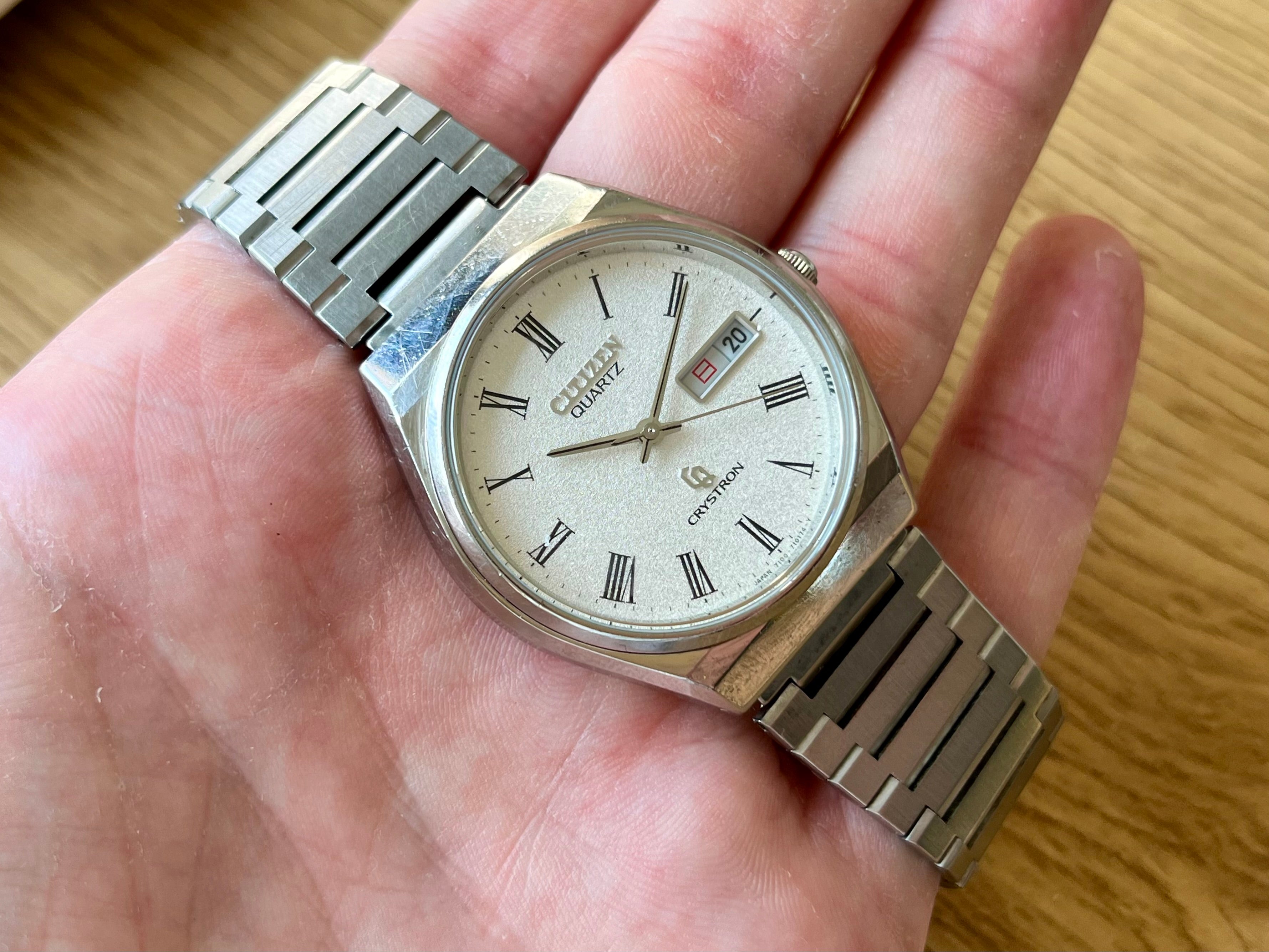 Vintage Citizen Crystron Quartz Watch Ref 4-730381TA with a so-called "Rice Paper" Dial in white with black Roman Numerals. I wish Citizen would start making dials like this again!