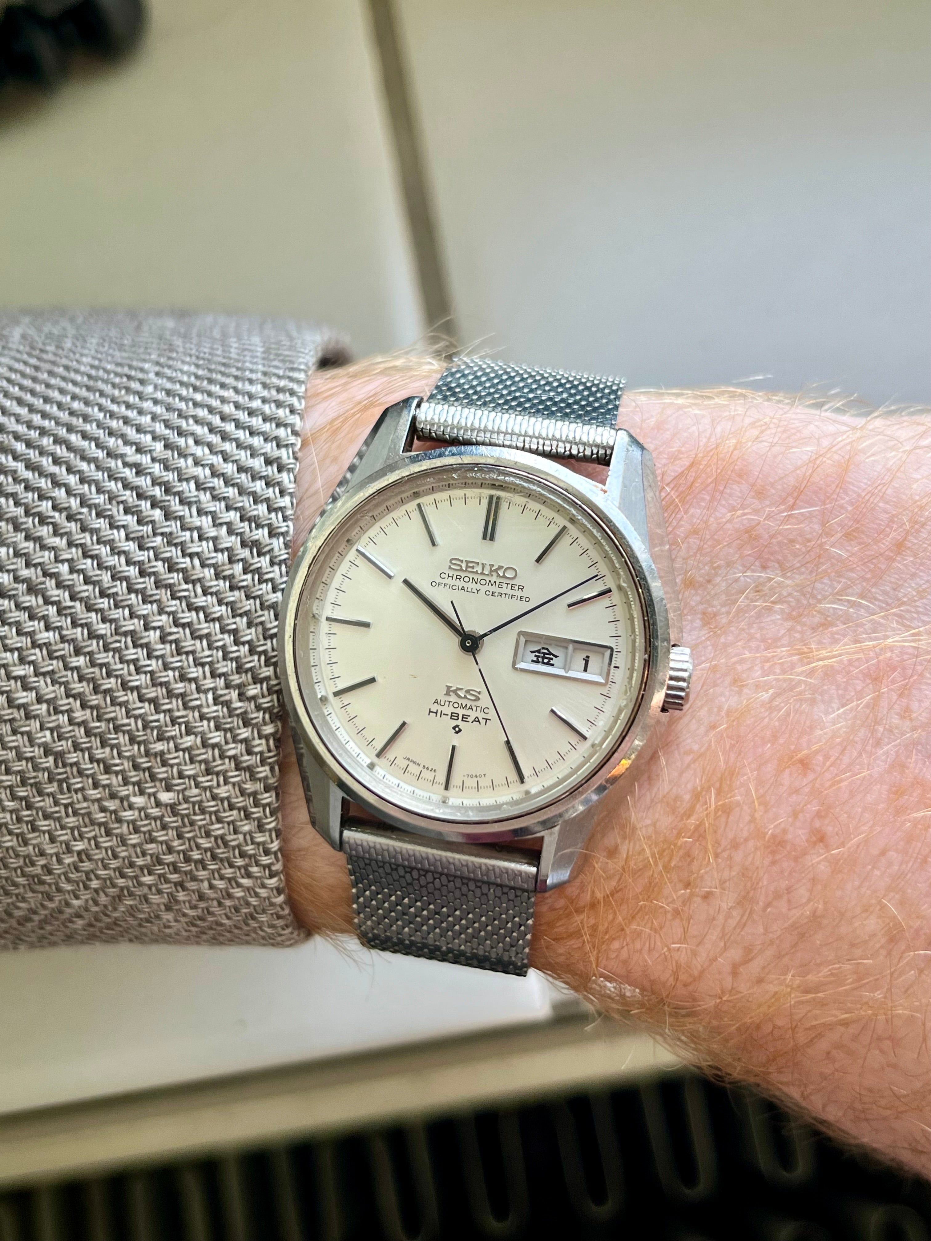 The 35mm case is in original, untouched and unpolished condition and has an unique case shape, slightly appearing "thicker" towards the lugs with multiple facetts. It has scratches, but I prefer original, untouched cases over polished ones. With a 42mm lug-to-lug it wears relatively big for it's case diameter. It is paired here with a vintage mesh bracelet that goes well and can be easily adjusted. It does have a later, plain stainless steel caseback (not a KS-medaillion) but this also means it's still in great condition - but has a nice recessed 'KS' signed (original) crown.