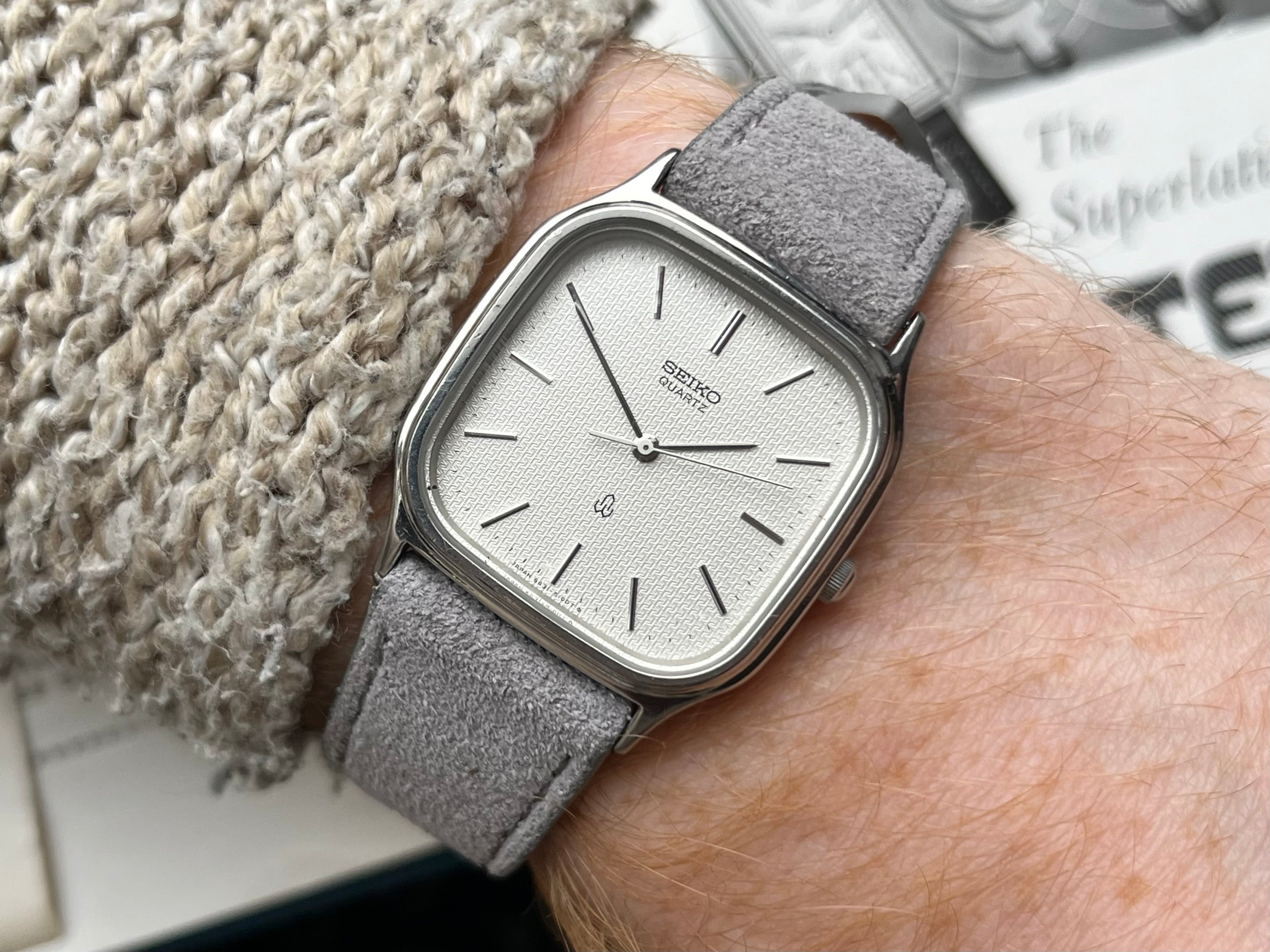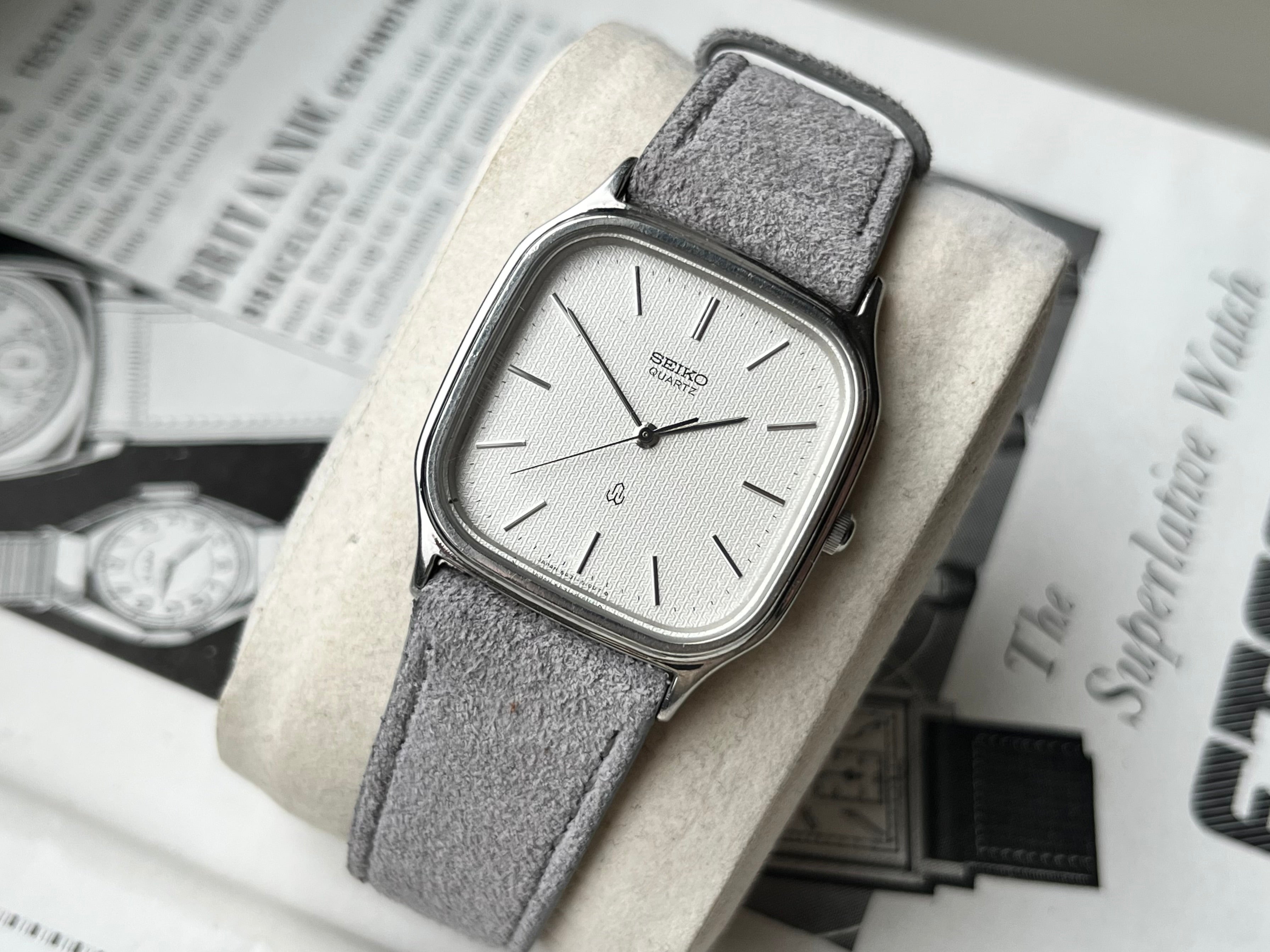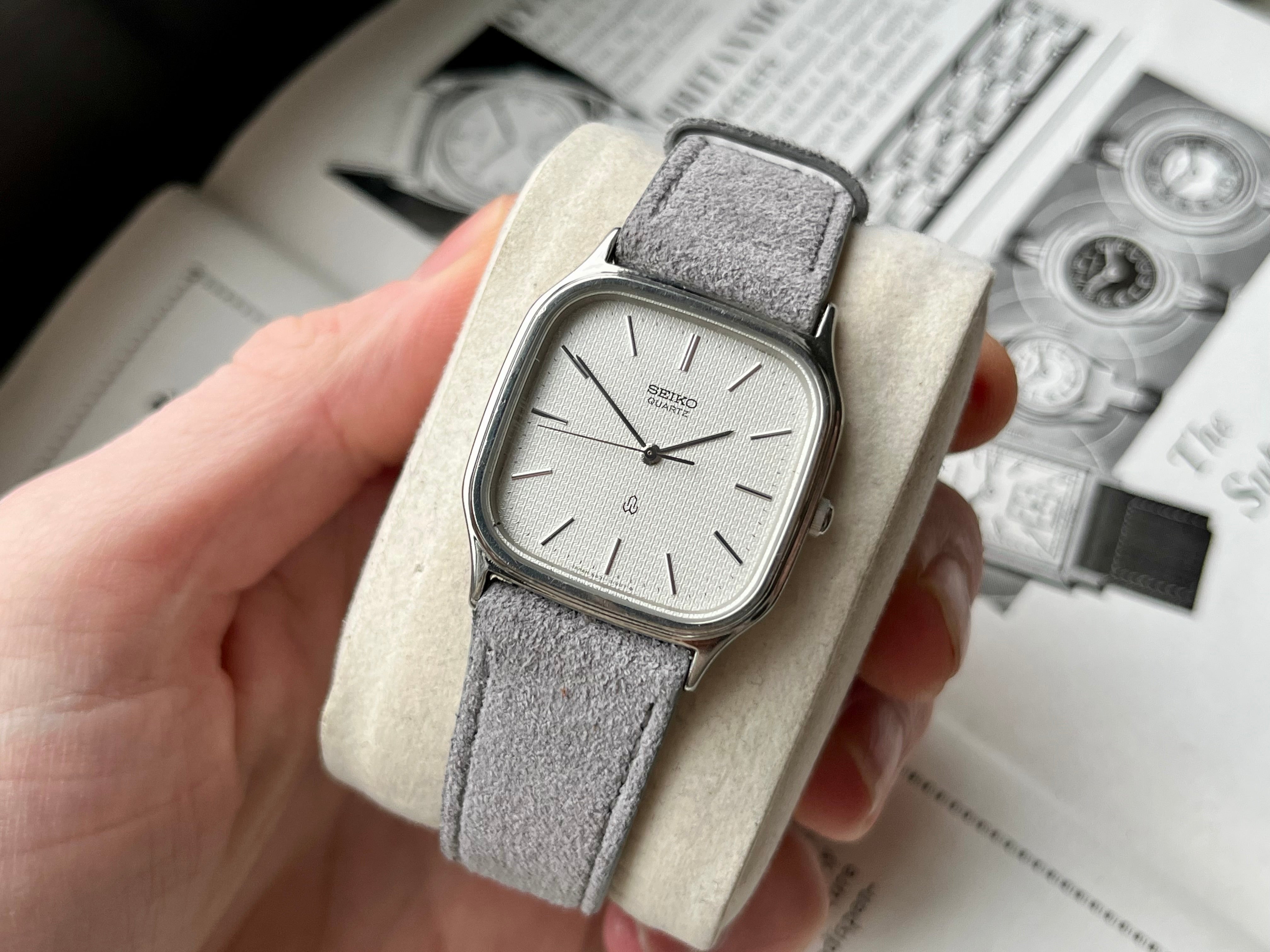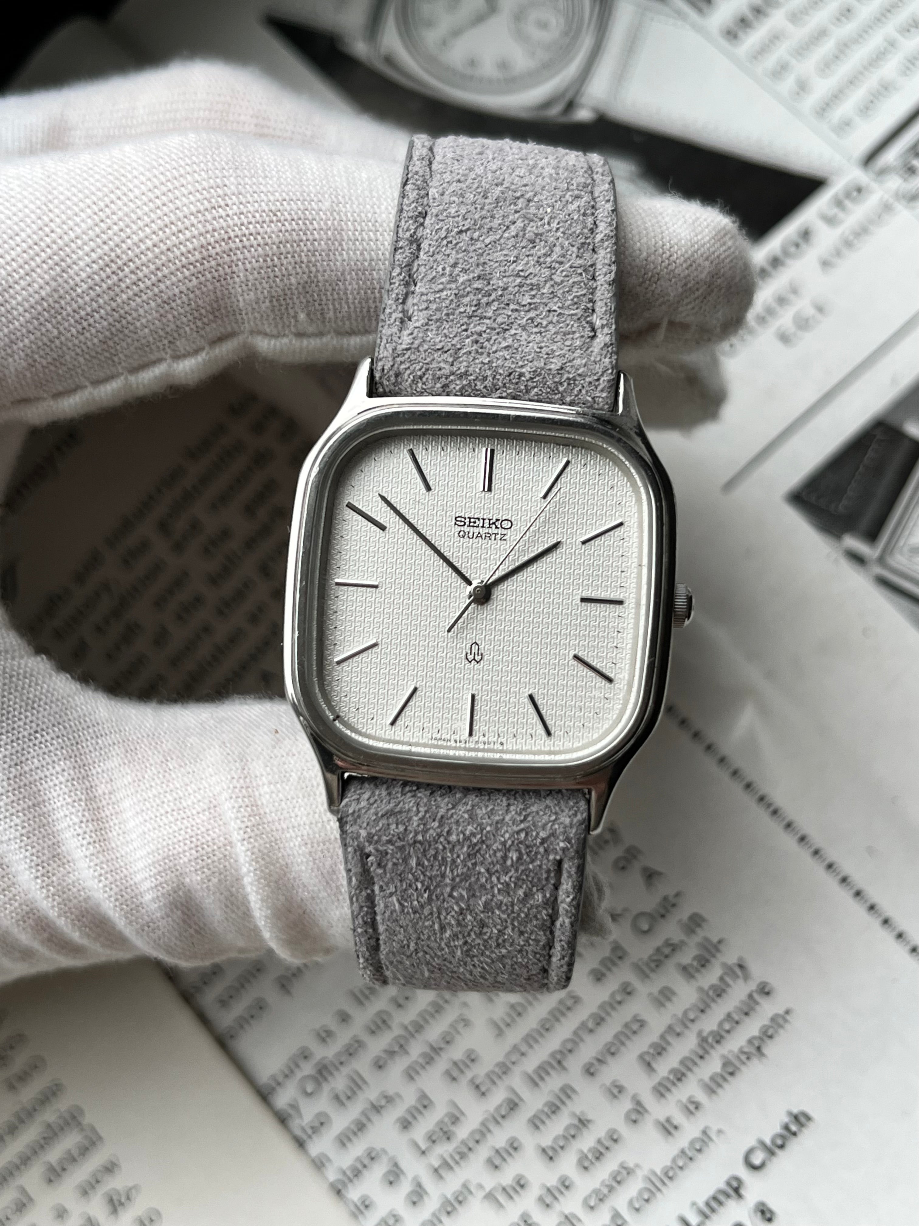 This Seiko Chariot is still in great condition, has been cleaned and received a new fresh battery to ensure it is in perfect working order, keeps time and sets smoothly. I've paired it with our Nikko Suede Strap in Grey.