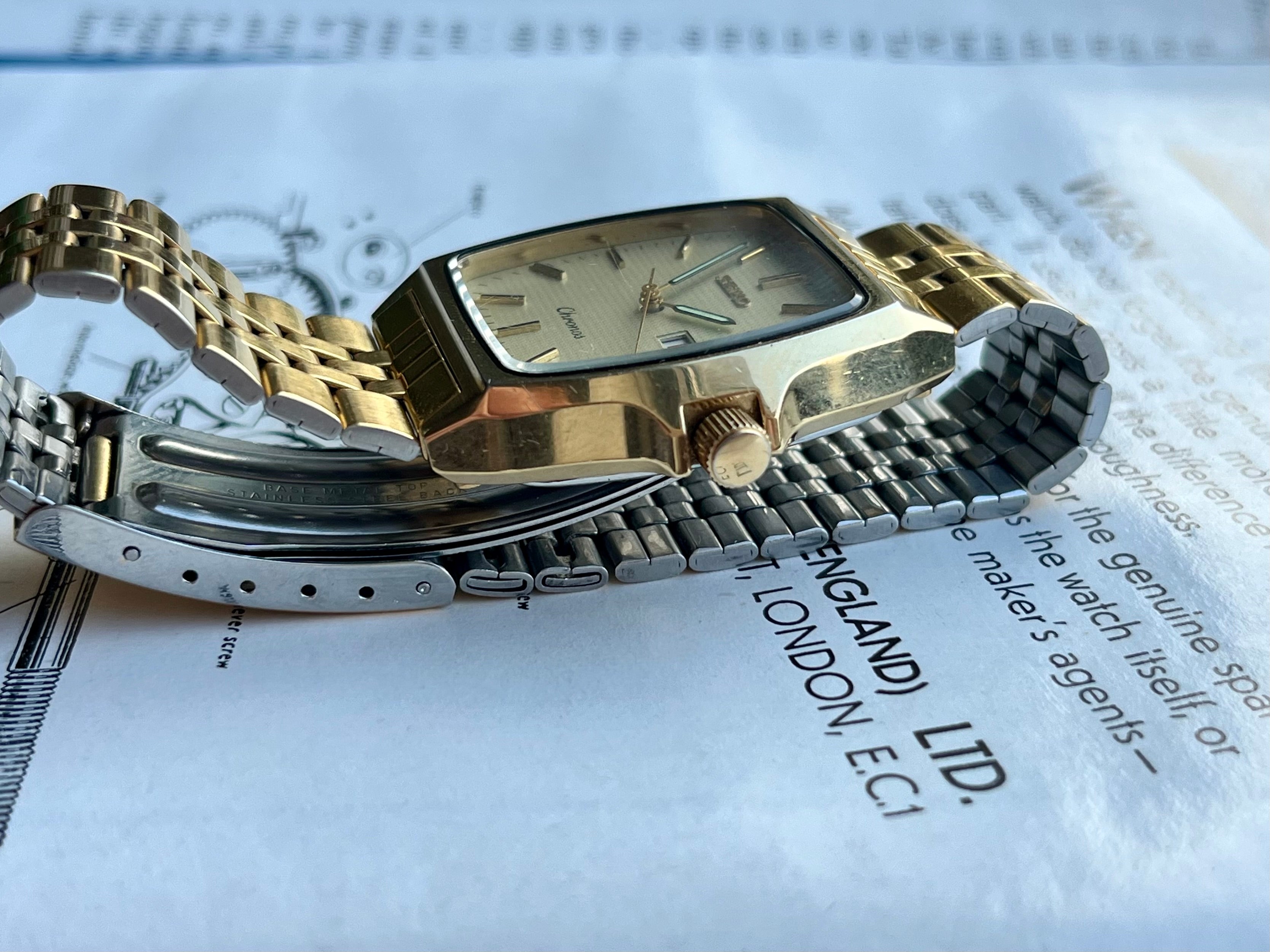 Beautiful rectangular case shaped Seiko Chronos watch Ref. 5H23-5110 from 1988 with beautiful white-silver pattern in the dial. The case is SGP and has slightly discoloured/detoriated, but it is still a eye-catcher!
