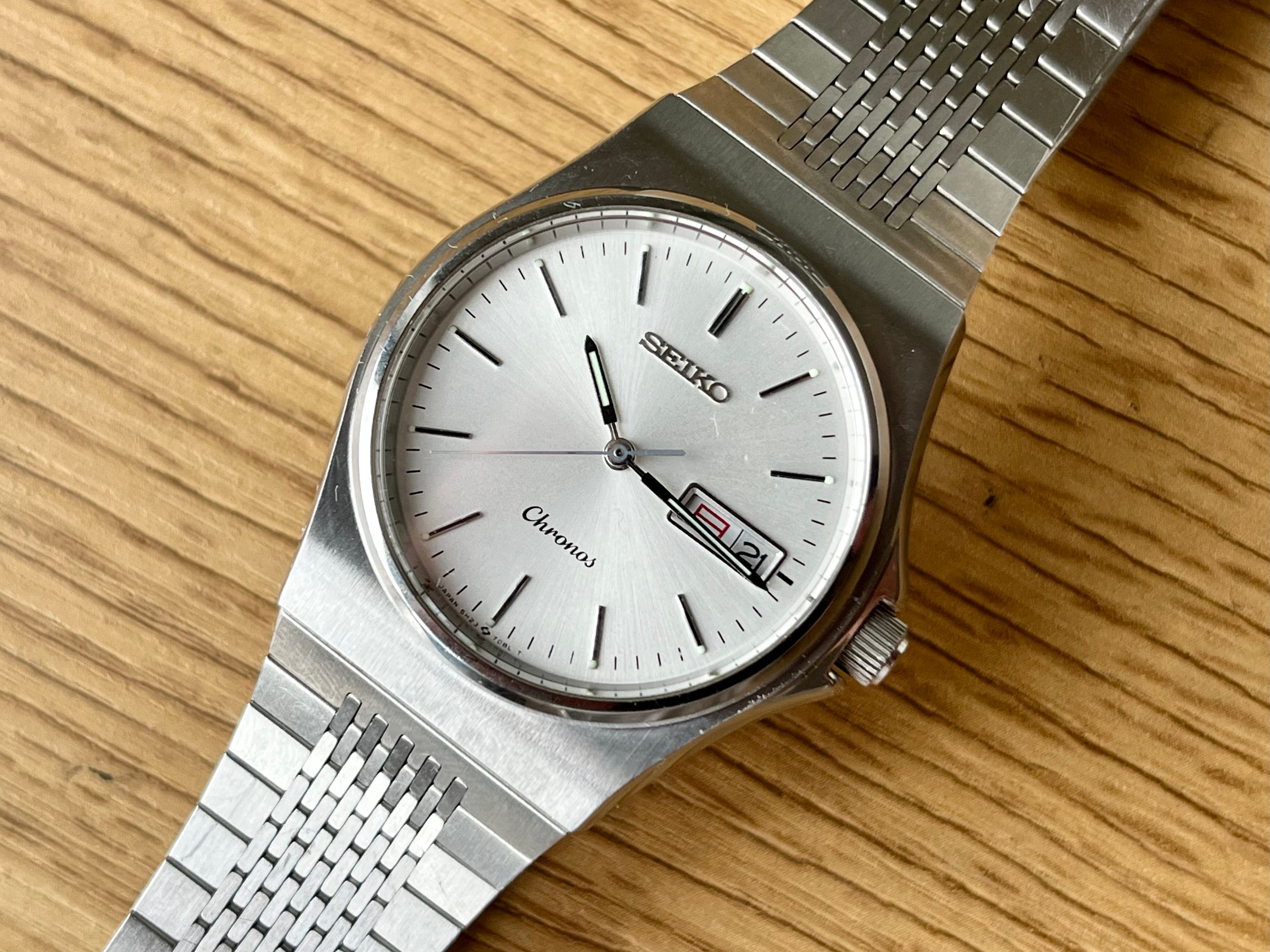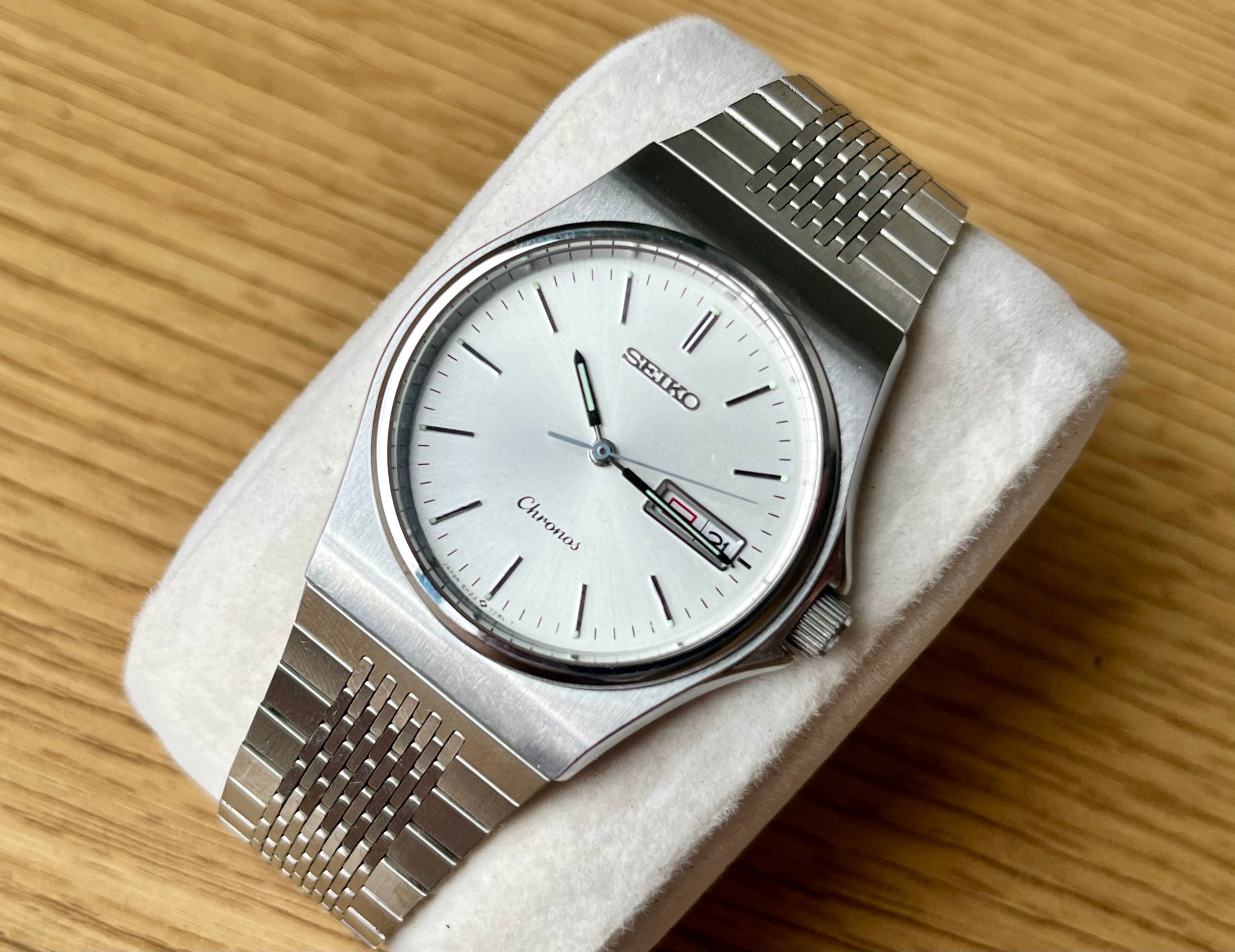 This Vintage Seiko Chronos Watch is a perfect quartz watch from the late 1980's featuring the more modern 5H23 quartz movement but still has the classic vintage Seiko Style with very eligble white dial and sporty case looks. I really like these Chronos series, they are affordable yet reliable JDM vintage watches. The SBMF007 cost 23.5k yen back then, equivalent to around 150 euros.