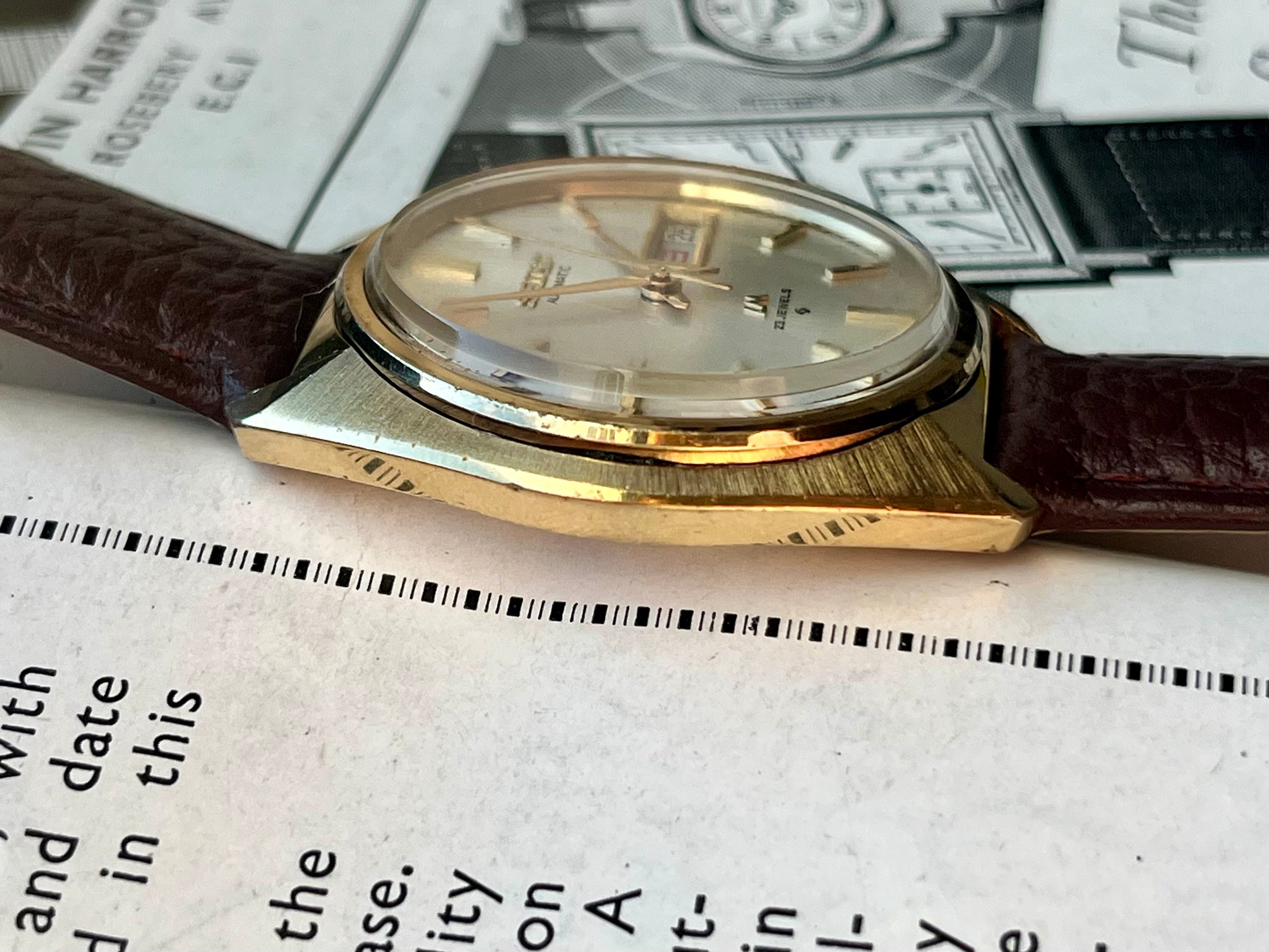 This Seiko Lord Matic from the 1970s is probably the best quality vintage you can get for this price bracket. Automatic, unique design & nice specifications: Brushed front and polished sides in gold-colored (stainless steel gold plated) case, beautiful white sunburst dial with applied indices and LM logo. Kanji/English day indication.