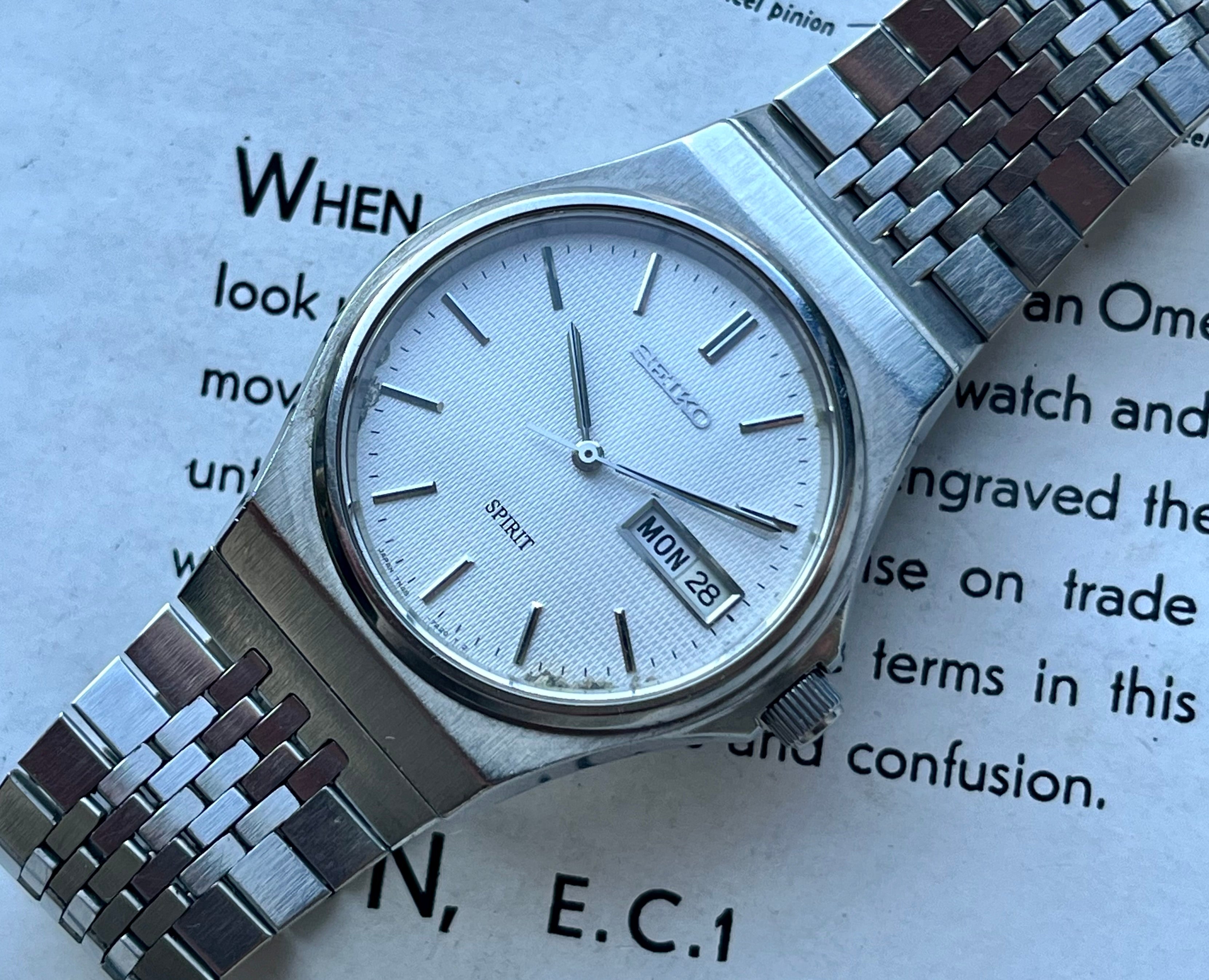 Discover this exquisite Seiko Spirit Series timepiece, a coveted JDM (Japan Domestic Market) model from 1995. The watch features a captivating relief pattern on its silver dial, complete with Kanji/English day indications, and is presented on its original D035AB-E band. In faircondition, this top-tier no-nonsense watch boasts a Seiko Cal. 7N48 movement, a 35mm diameter, and an 8mm thickness.