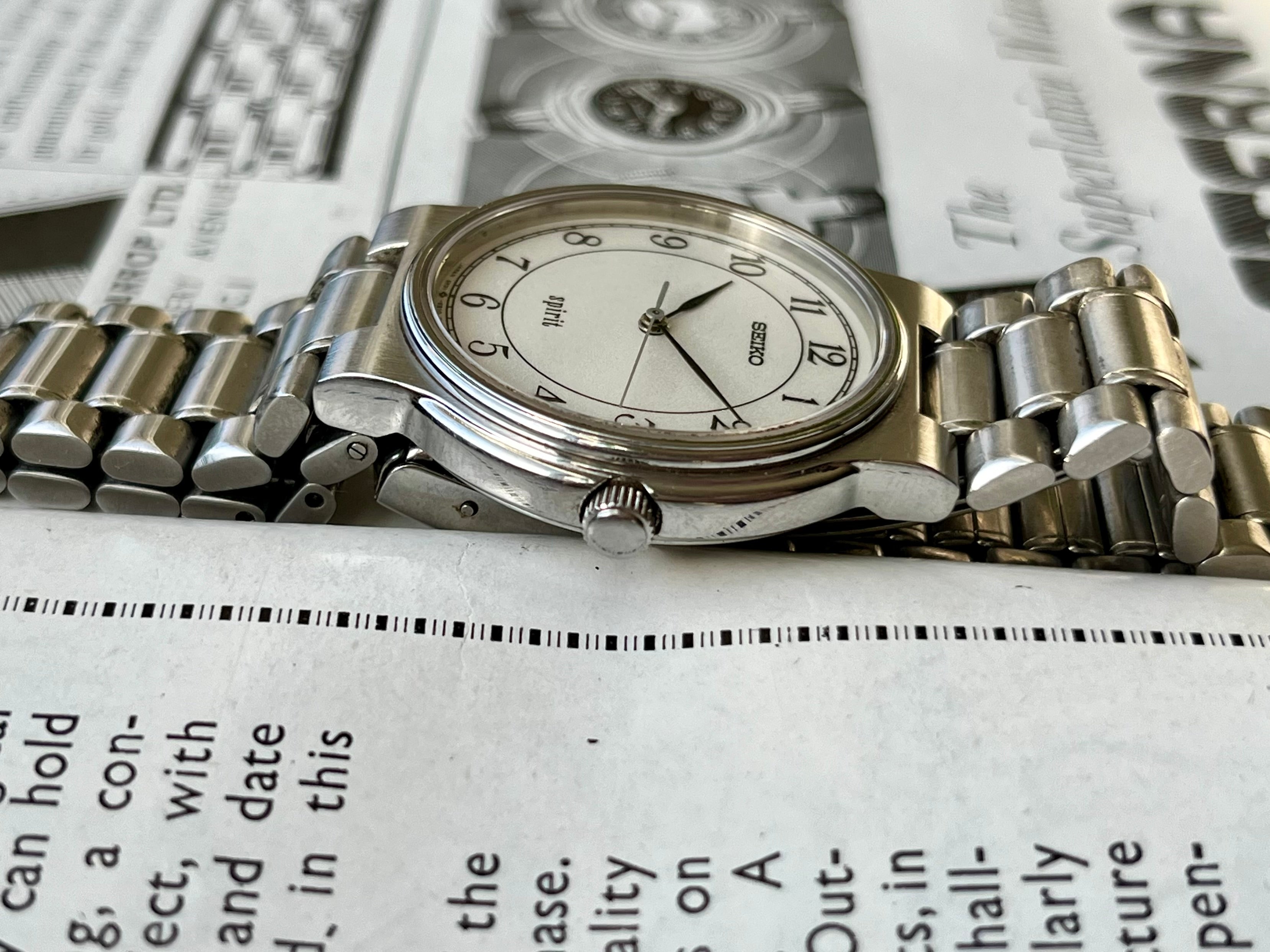 Deze Seiko is gemaakt van "Hard Stainless Steel" (vrij vertaald van de " HSS " materiaalmarkering op de achterkant). Ik weet niet precies wat dit "harde" roestvrij staal precies is ( en ik denk niet dat ze dit materiaal hebben voortgezet) - maar Seiko vroeg er absoluut een hogere prijs voor vergeleken met andere Spirit-modellen! De wijzerplaat is grijsachtig, maar heeft een heel subtiele vonk - alsof iemand een beetje glitter over de wijzerplaat heeft gegooid - en wordt geleverd in een traditionele Romeinse configuratie.